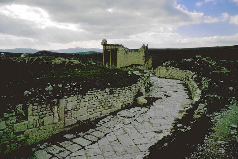 tunisia dougga: cityscape street with house entrances temple to rear ? 2 AD