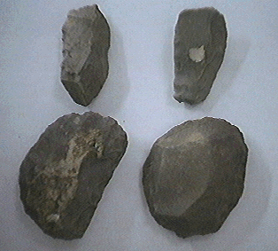 There are two types of adzes within the collection - the burren and the tula. The difference between the two is the location of the working edge. On a burren adze (usually almost triangular in shape) the working edge is perpendicular to the striking platform. While on the tula adze the working edge is parallel to the striking platform. Also the tula adze characteristically has an obtuse angle between the striking platform and the bulb of percussion surface. When the adze becomes blunt, it is re-worked and with continuous modification and retouch eventually reulting in a step flaking.